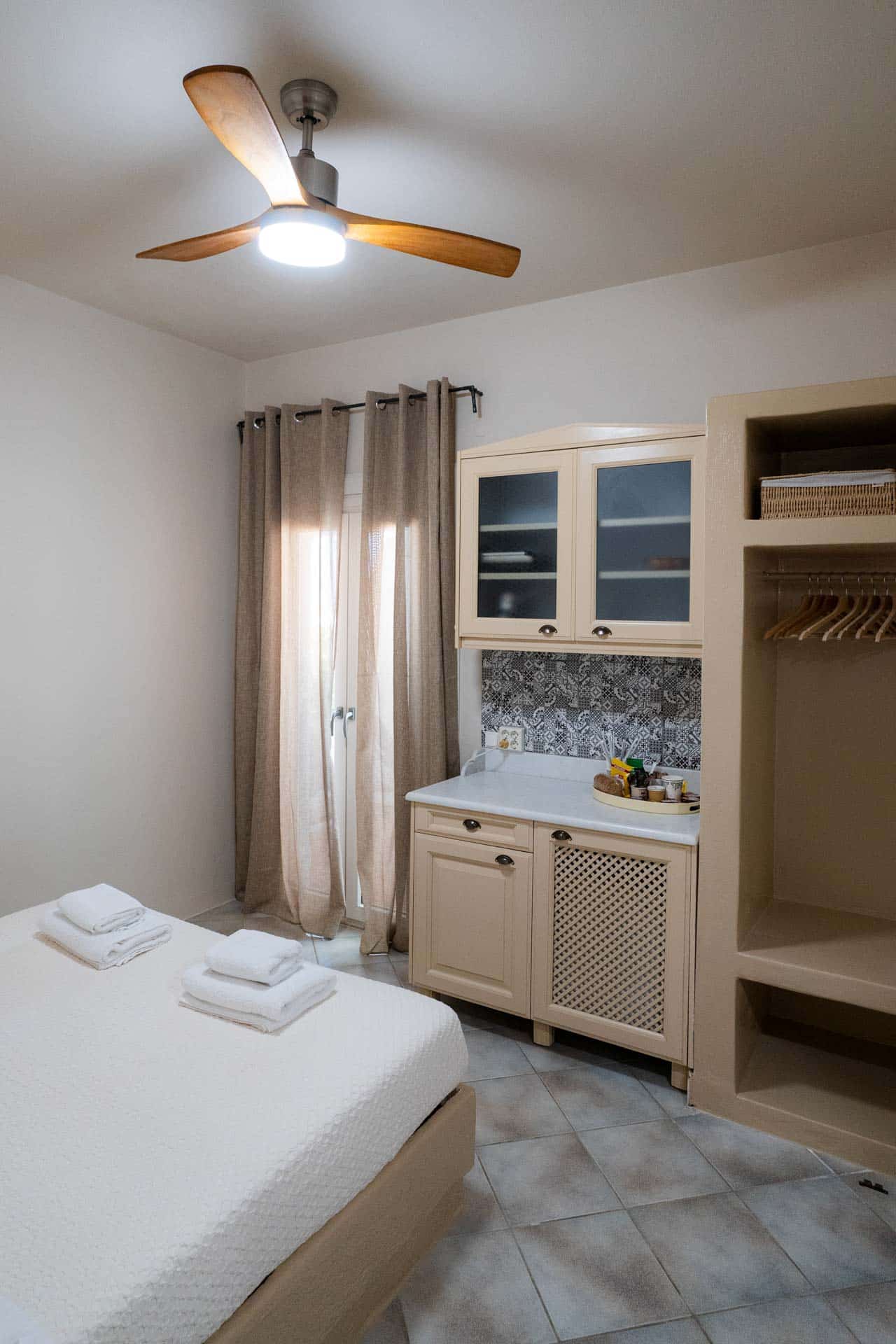 Υπάρχει επίσης μια κουζίνα με τον απαιτούμενο εξοπλισμό (ψυγείο, καφετιέρα φίλτρου, τοστιέρα, ηλεκτρικό αναδευτήρα, βραστήρα, ηλεκτρικό μάτι κουζίνας) και ένα καλάθι με καλούδια για ένα ευχάριστο πρωινό.